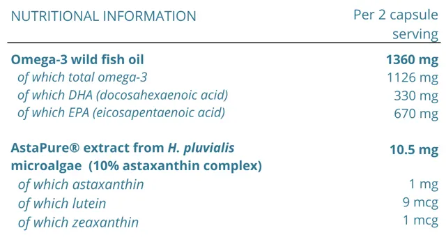 Ingredients: Omega-3 EPA & DHA concentrate (as re-esterified triglyceride) from wild fish oil; capsule shell (fish gelatine, vegetable glycerol); natural lemon flavour; AstaPure® astaxanthin (H.pluvialis microalgae).