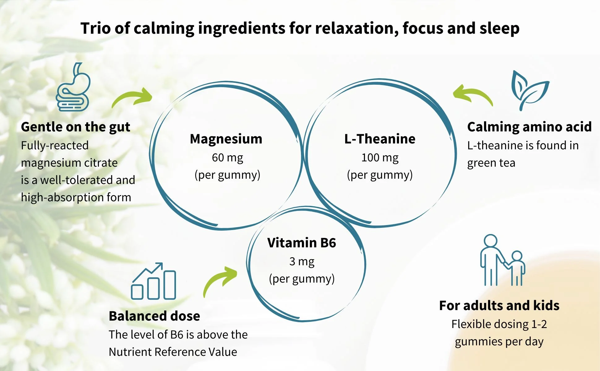 a blend of magnesium citrate, L-theanine and vitamin B6, formulated to promote a calm focused mind throughout the day, and relaxation before bedtime for a restful night’s sleep