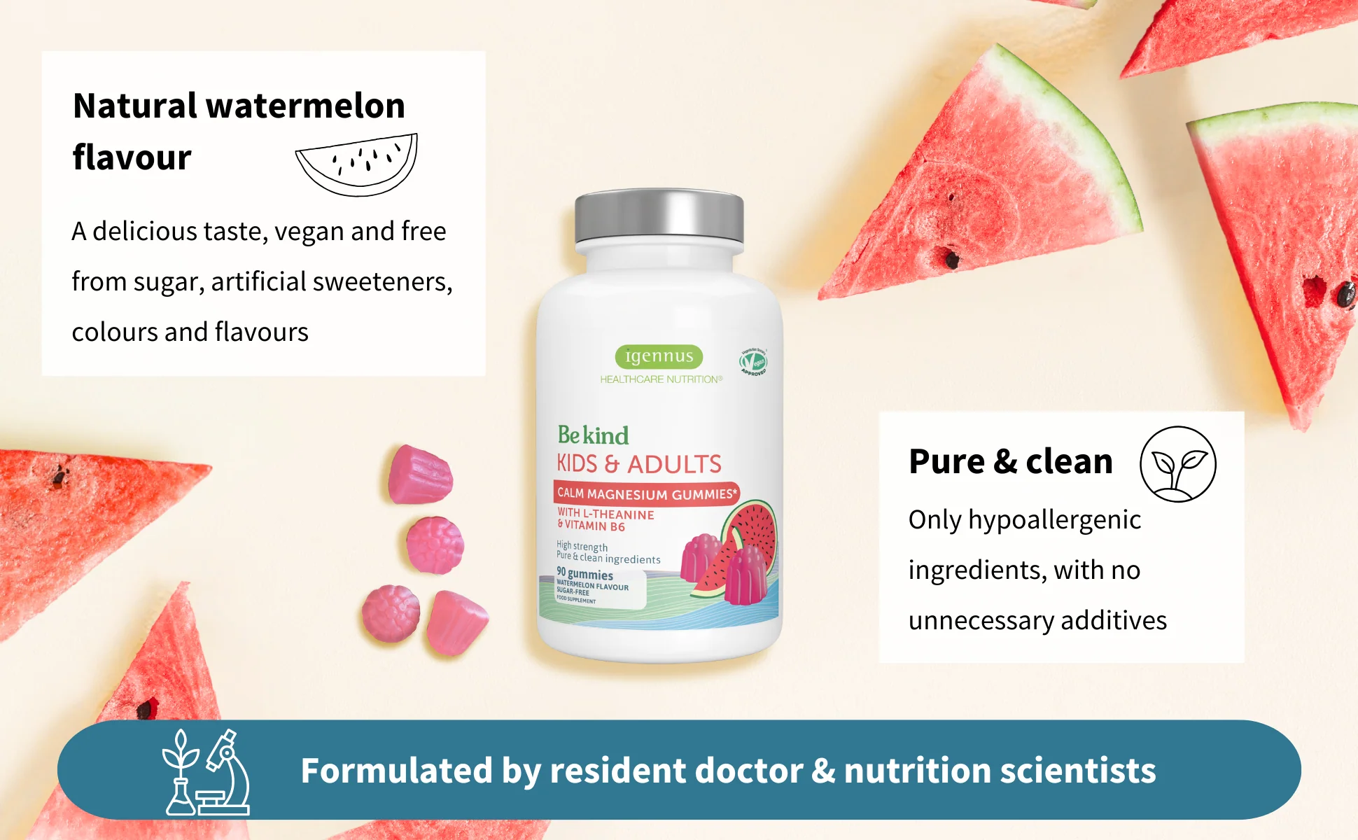 Be kind Kids & Adults Calm Magnesium Gummies have been expertly formulated to promote feelings of calm with a high strength blend of magnesium citrate, L-theanine and vitamin B6. This high absorption formula contains only hypoallergenic ingredients, with no artificial colours, flavours or sweeteners. The natural watermelon flavour gummies are developed for adults and kids aged 4+.