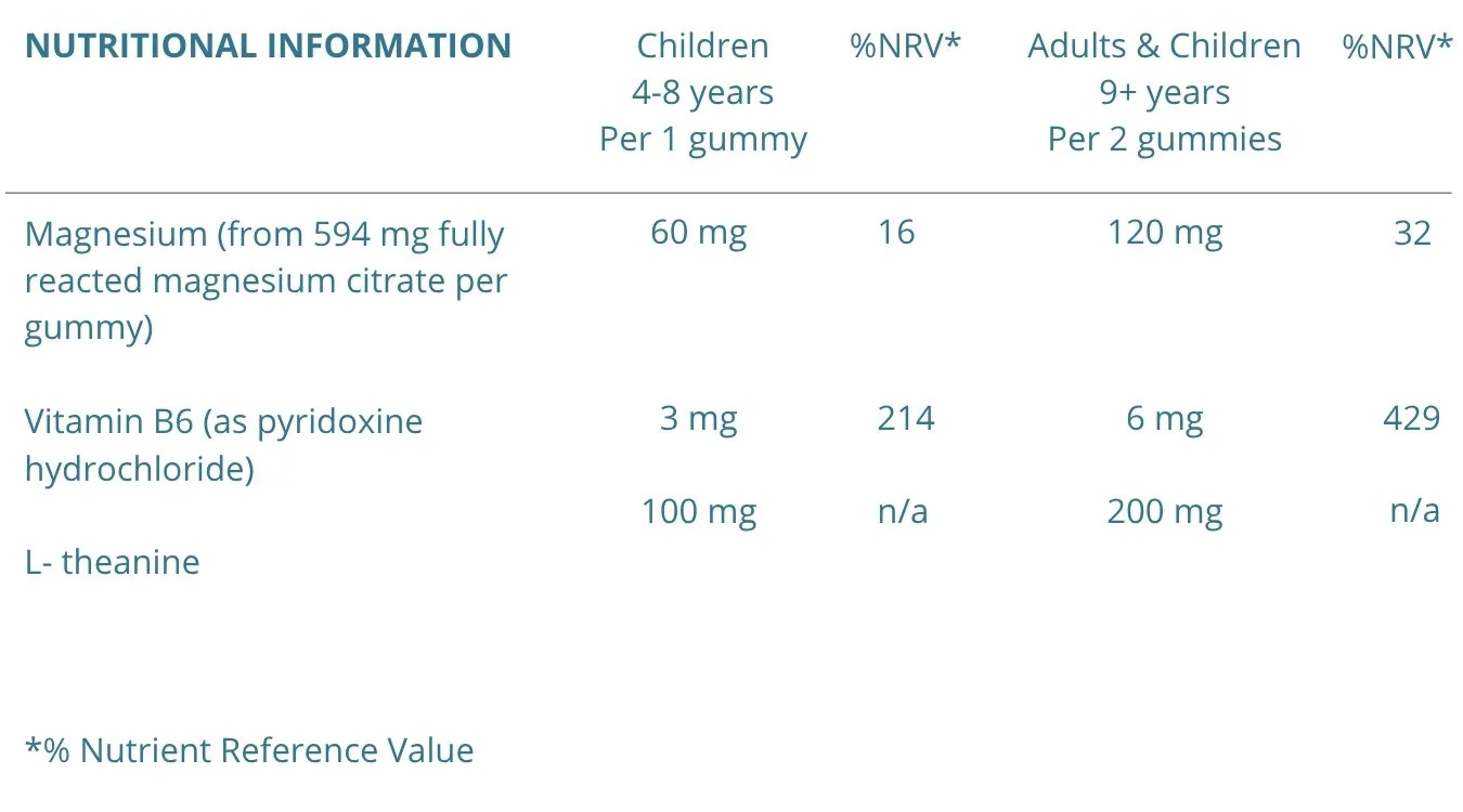 Ingredients: Sweeteners: maltitol, steviol glycosides from Stevia; magnesium citrate; purified water; L-theanine; gelling agent: agar; natural flavour: watermelon; acidity regulator: citric acid; glazing agents: sunflower oil, rice flour; vitamin B6 (pyridoxine hydrochloride); thickener: carob gum; natural colour: carrot.